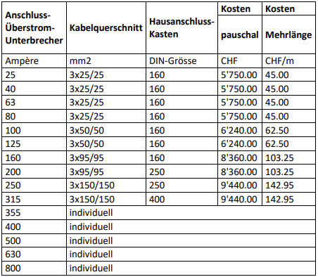 Innerhalb der Bauzone gelten folgende Pauschalen für den Netzanschlussbeitrag mit einer Kabellänge bis 25m gemäss nachstehender Tabelle. Die Kosten für die baulichen Voraussetzungen (Tiefbau, Rohranlage, Gebäudeeinführung etc.) sind darin nicht enthalten.